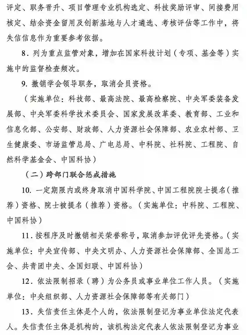值得注意的是,此次《备忘录》对科研领域失信行为责任主体作出了高达43项联合惩戒,包括一定期限内或终身取消中国科学院、中国工程院院士提名(推荐)资格、院士被提名(推荐)资格。依法限制招录(聘)为公务员或事业单位工作人员。