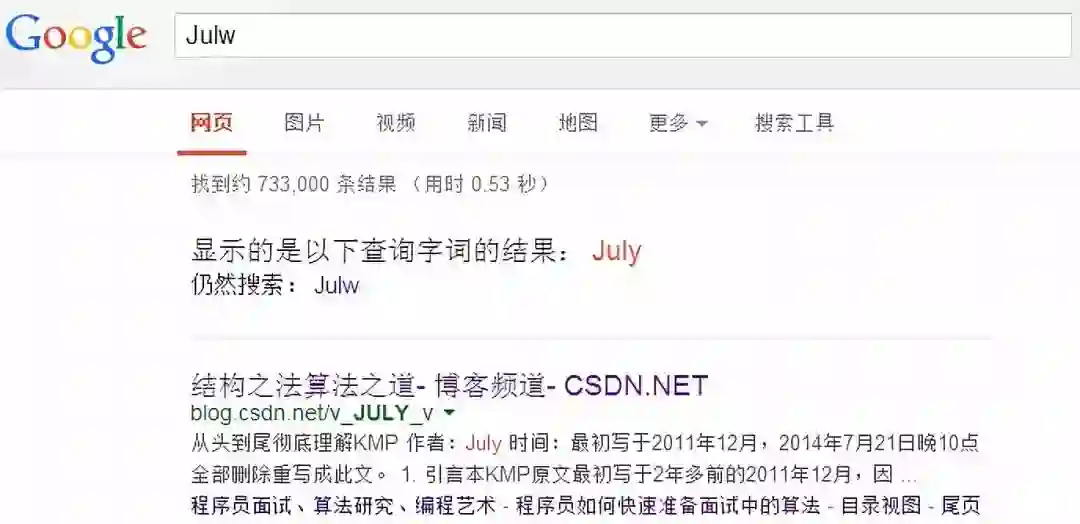 当你不小心输入一个不存在的单词时,搜索引擎会提示你是不是要输入某一个正确的单词,比如当你在Google中输入“Julw”时,系统会猜测你的意图:是不是要搜索“July”