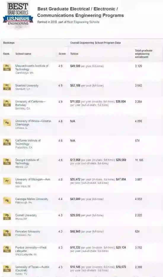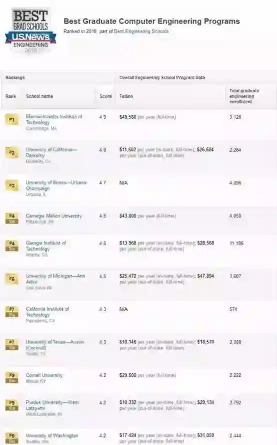 MIT不出所料依然蝉联榜首,Stanford和UC Berkele稳居第二三名,相比去年,普渡大学形势大好,一跃升至第五名,而卡内基梅隆大学却跌出了前五。