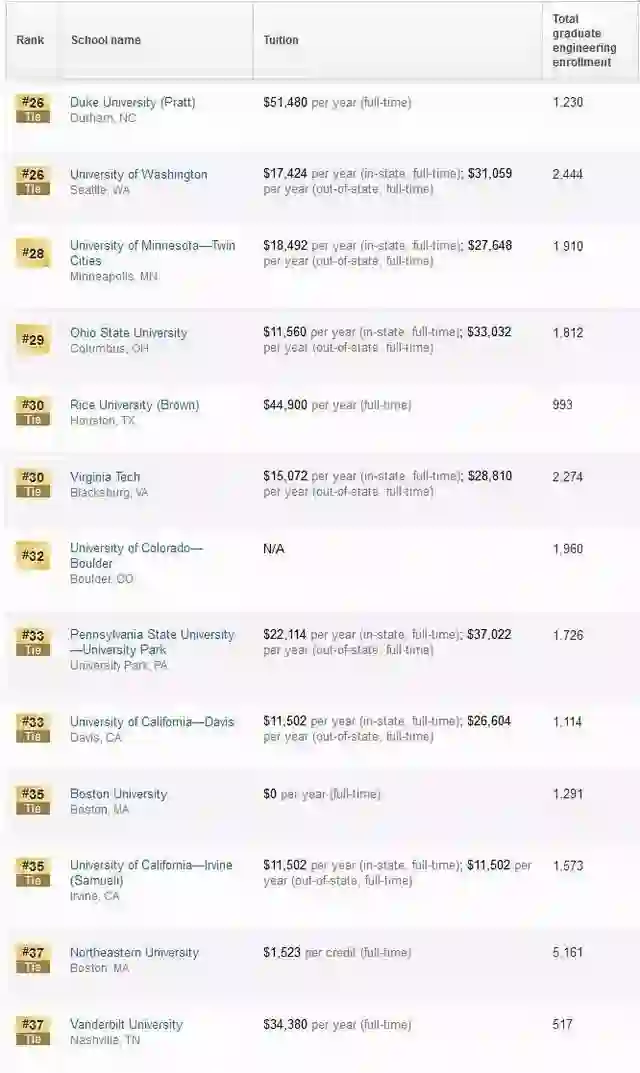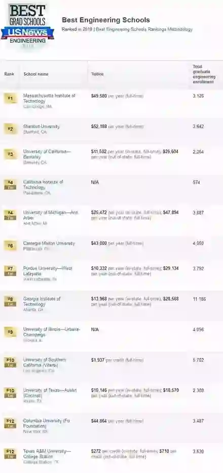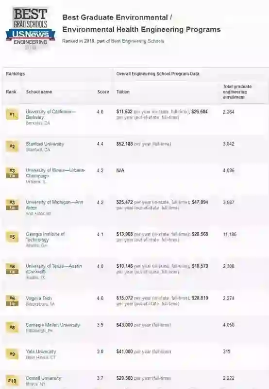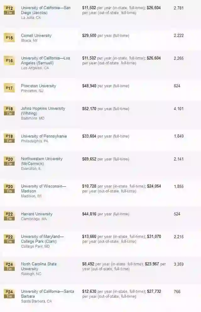 工学类中,USNews对计算机工程、电子/电气/通信工程、航天航空工程、生物工程、生物医学工程、化学工程、土木工程、环境工程、工业工程、核工程、石油工程、机械工程、材料工程13个分支进行了具体排名。