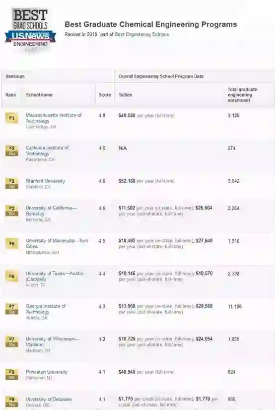 化学工程前10排名: