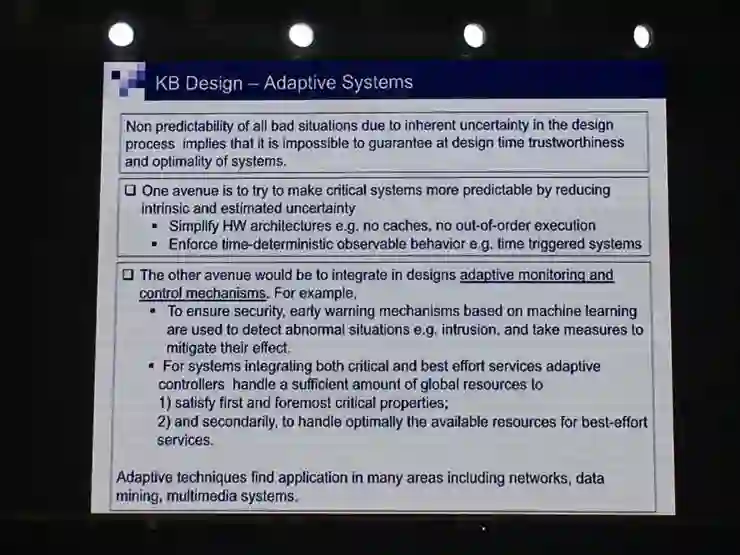 需要我们在进行系统设计的同时,也考虑到设计的标准:需要考虑到系统必须是非常值得信任的。我们还有一些可以控制的系统,可以进行和系统、环境之间更好的合作,这就是适应型的控制器,如此一来,这个系统就会变得足够安全。有的时候,系统也会出现一些问题,我们要对系统进行监控。如果问题出现,我们需要降低这些缺陷,这是共识。我们经常在有些区域运用这些方法,计算系统中有各种控制理论,我们使用控制为基础的各种技术来确保计算的正确性。尽管如此,还是出现了一些不可预估的风险,所以一开始的系统的设计就显得非常重要,我们需要确保这一点。以知识为基础的设计(包括它的设计时间的知识),有时,我们不能保证这个设计时间,因此,我们需要建立一些特性,设计流程的某些步骤能够保证真正在执行的时间,能够保证完全真实的执行情况。
