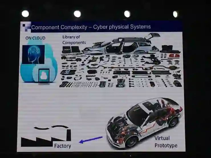 我来向大家展示该信息物理系统,未来,所有的物体(无论是汽车还是其它的元件)都基于信息物理系统。也就是说,存在机械的部件,但是每一个机械部件都有一个计算机软件来对应它。不同的零部件对应不同的电脑软件。这里,有一些可靠的软件部件,还有硬件,我们用两个构件来构成这样一个模拟的自动驾驶系统模型,再将模型发送到工厂,这就是工业 4.0 的概念。
