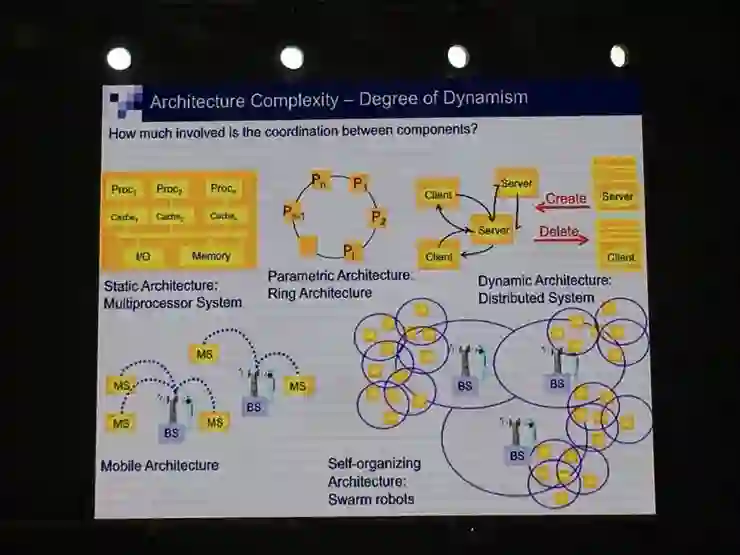 还有一个是自我组织的构架,这是一个移动的构架,但是它不只有一种协调,它有非常多的协调规则,不只是一套规则。比如,你可能要自我构架一辆车或者是其它设备,因此,我们可以看到有静态的构架,还有参数型的构架,还有动态的构架,还有自我组织的构架。