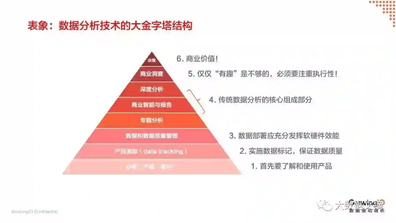 《报告》中也提到,公司对数据价值的认知是非常高的,但数据团队的价值落地艰难。其实大部分的原因还是因为我们太关注于技术底层的建设,而忽略了上层的商业本质。这其实也是一个两难的境地,下层的技术框架搭建耗时长,没有人能越过这些下层一下子就跳到最后一个决策层去。