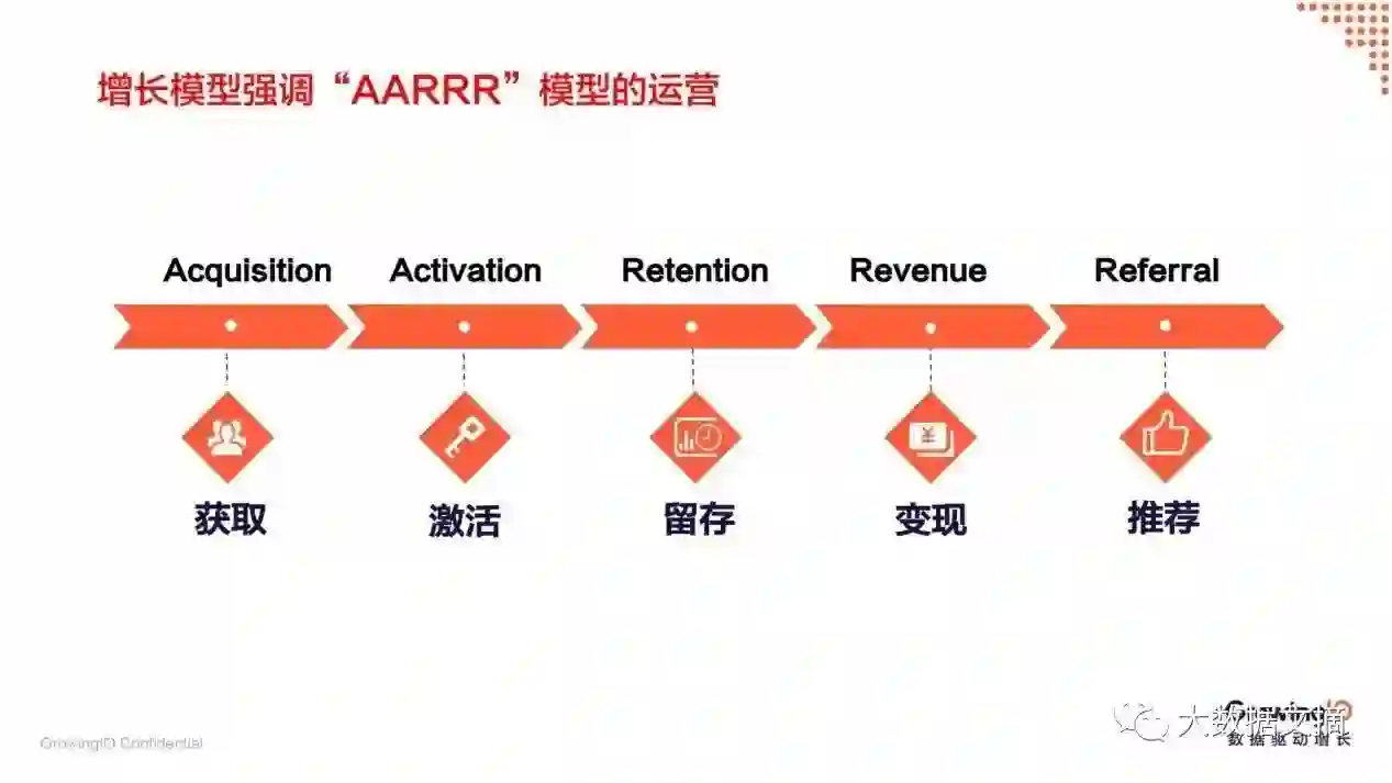 这实际上是需要负责人从流量型思维向客户型思维转化。流量型的思维是指通过多平台多渠道打广告的方式获取客户,拉取流量。这种方式成本低,能大量吸引新的客户,但是赚完这些客户的钱以后,就把他们抛弃了。客户型的思维就是利用高成本的广告或方式获取客户,并对客户进行再运营,不断从既有的客户身上获取价值,甚至通过客户创造更多的价值。我们可以参考“增长黑客”增长模型的五个环节: