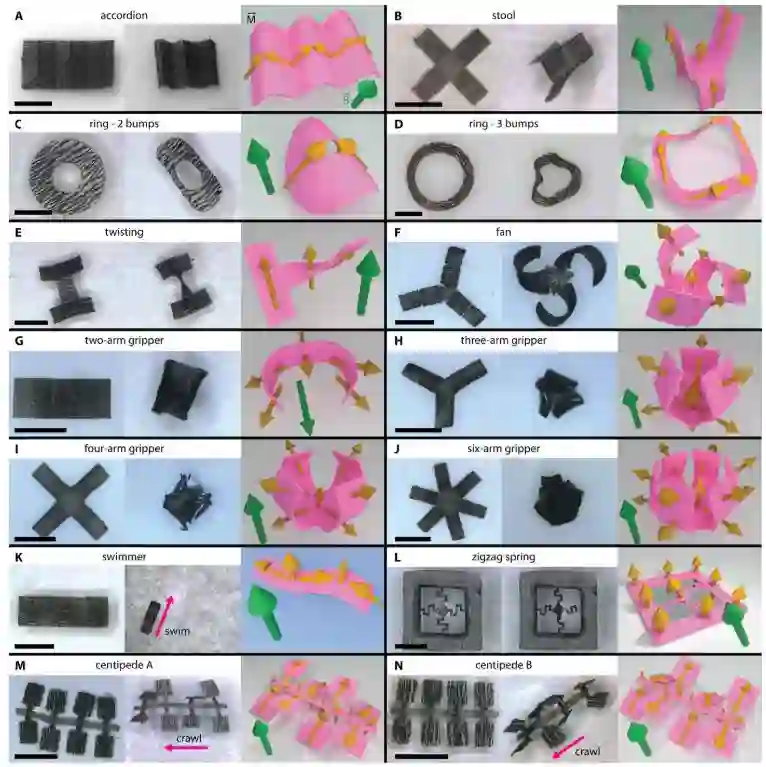 图2:具有分布式3D磁化分布的柔性磁平面结构。黄色箭头表示局部磁化的方向,绿色箭头表示致动磁场的方向。材料厚约80微米。“手风琴”的驱动磁场为200 mT,其他所有磁场均小于20 mT。所有组件都可以在原始形状和折叠形状之间进行快速可逆转换。