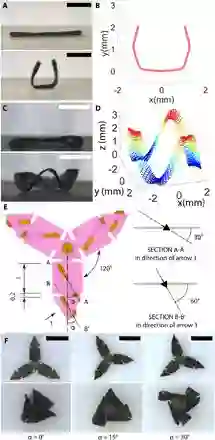 图3 用于预测形变的模型和在3D环境下调整制造角度组件。(A)侧视图像显示出在20mT磁场下的大角度偏转。(B)大角度偏转的数值模型。(C)侧视图显示20mT磁场下环的波动弯曲。(D)使用有限元法进行模拟。(E)三臂结构的几何形状,尺寸和磁化分布。单位:mm。(F)具有不同磁化分布的三臂结构的俯视图。比例尺:2mm。