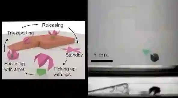 研究人员使用一对强力的磁铁来翻转机器人特定部位的钕的极性,使它们在磁场中发生排斥和吸引,从而实现折叠。然后,他们将紫外线照射在这些部位上,固化嵌入在里面的材料,并将它们锁定在特定的位置。