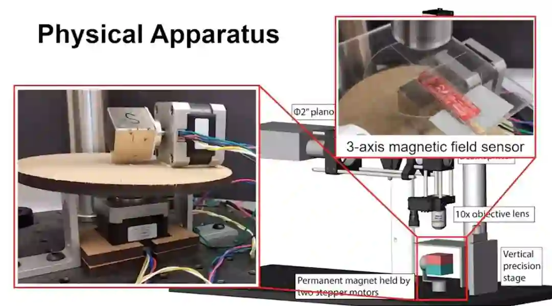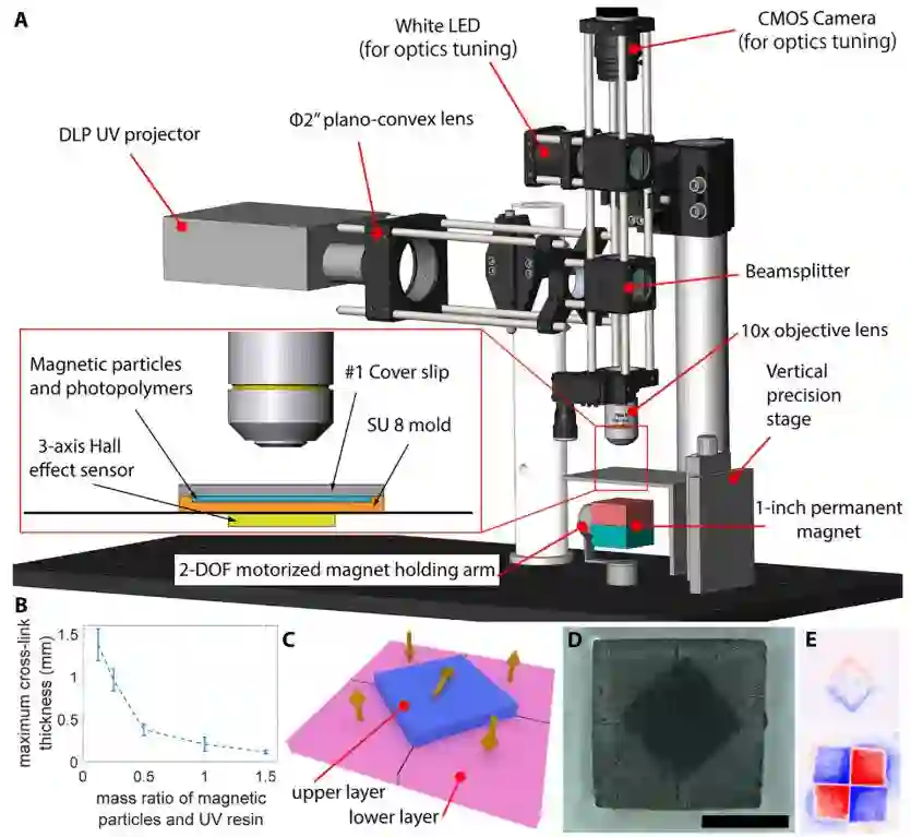 图1:用于图案化离散3D磁化的系统示意图。(A)用于在UV可固化弹性体基质复合材料中图案化永磁颗粒的物理设备。DOF:自由度。(B)实验测量的最大交联厚度相对于磁性颗粒浓度。误差条表示SD。(C)具有水平和垂直磁化分量的双层结构的示意图。黄色箭头表示在每个块中的磁化方向。(D)双层结构的顶视图图像。单位比例尺代表实际长度2毫米。(E)使用磁光传感器分别在各层的近表面处测量的面外磁通分布。利用独立制造的两层拍摄磁光图像以更好地可视化磁化分布。