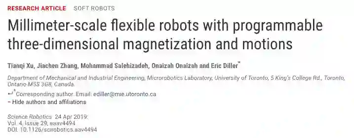 来自多伦多大学微型机器人实验室的徐天启 (Tianqi Xu)、Jiachen Zhang、Mohammad Salehizadeh, Onaizah Onaizah 和 Eric Diller 等人近日在 Science Robotics 杂志上发表了该研究的论文。