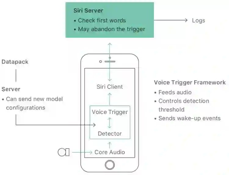 iPhone 或 Apple Watch 激活 Siri 不仅要求快速准确,还要求不会对电池的寿命产生重大的影响以及尽可能少的占用内存和处理器。为了避免主处理器一直处于检测触发词的状态,iPhone 中的 AOP(一种小且低能耗的处理器)会使用其一小部分处理能力来运行一个探测器和一个小版本的声学模型。当信度分数超过最低阈值时,AOP 会「提醒」主处理器进行下一步操作。