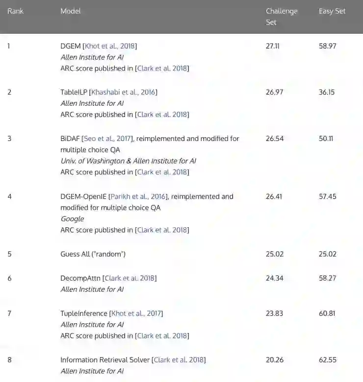 目前市面上有很多智能语音问答产品,其中绝大多数给人的感觉就像是个玩具,甚至有些 “弱智”。为了解决 AI 在高级问答上的难题,近日,国外研究团队 Peter Clark 等人发表了一篇论文题目为:Think you have Solved Question Answering? Try ARC, the AI2 Reasoning Challenge(觉得你已经解决了问答难题? 来尝试 AI2 推理挑战赛吧(ARC)!这篇 paper 中提出的数据集也是小学自然科学领域目前最大的公开数据集。(文末有下载地址)