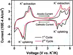 然而,在过去起步的 5 年时间里,一系列新发现与报告详细列出了可以备选为钾电池阴极的材料。其中,最值得关注的是一种铁基化合物,其晶体结构类似于普鲁士蓝(亚铁氰化铁)粒子,并且有广阔的空间供钾离子填充。