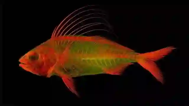 今年9月,劳伦斯堪萨斯大学的生态学家史密斯(W. Leo Smith)发表了一项新的X光成像技术,他发现,茜素红染料在波长适当的光线下,会发出明亮的红绿荧光。在荧光显微镜的帮助下,他不仅可以观测到红色的骨骼,软组织和肌肉也会通过绿色荧光展现在画面上。一条丝帆鱼成为了这项技术最先的应用者。