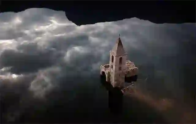 在西班牙维拉诺娃德绍接近干涸的水库中,一座11世纪教堂露出水面。沉静的水面倒映着光暗分明的云层,如同一幅梦幻般的超现实主义绘画。