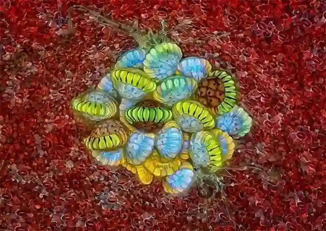 这是尼康微观世界显微摄影大赛上获得第2名的照片。获奖者吉尔在10倍紫外放大镜下,拍下了这张蕨类植物孢子堆结构的照片,颜色鲜艳,对比强烈。孢子是蕨类植物的生殖细胞。