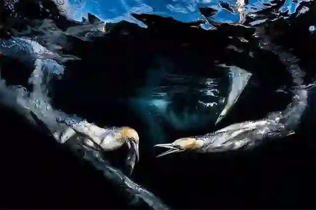 鲣鸟觅食时,会从30米的空中俯冲而下,以100公里/小时的速度一头扎进海里,捕食水面下的鱼群。摄影师在苏格兰水域抓拍的这个瞬间,获得了年度水下摄影师行为类比赛的第3名。