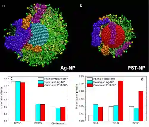 图2. 两种典型纳米颗粒(亲水银颗粒和疏水聚苯乙烯颗粒)上所形成肺表面活性剂冕的结构和组分