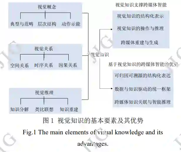 本文随后分析一种跨媒体智能研究的新途径— —视觉知识(Pan,2019)。视觉知识不仅关注图像 或视频等视觉信号,以及基于这些信号提取或学习 得到的特征,而且以视觉概念(通常由典型和范畴 构成)(Pan,2019)为研究要素,联合符号化知识 与逻辑推理、深度学习技术、知识图谱、手工构造的 知识(如结构化信息)等多种知识表达手段,将与视 觉主体相关的音频、语言等信号进行联合建模与推 理。这种性质与人类在理解和推理多媒体信号时的 处理流程是相似的——以信息量最高的视觉为主导、 并在其基础上关联语音、文字等感知与理解。这些 声音、文字等其他形式的信息又能适时地促进、增 强对环境和目标的视觉理解。这种多模态知识表达 互相增强的性质,也正是视觉知识所具有的多重知 识表达能力(Pan,2020;Yang 等,2021)。