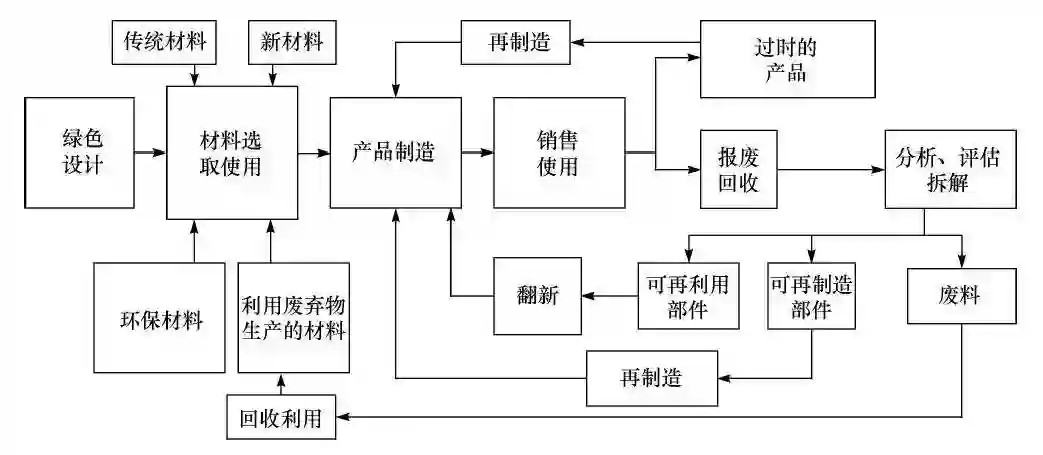 回收的目的是对废旧产品进行再利用、发展循环经济,机械零件的回收再生模式主要包括直接重用、再制造、再循环三种。其中,直接重用是将仍具备完好使用性能的零件直接在新的产品中加以利用,例如,发动机、变速箱的箱体等就可以直接重用;再制造是以废旧零件为毛坯,采用先进表面技术和其他加工技术对其损伤部位进行修复和强化,使其保持、恢复可用状态并加以重新利用;再循环是将废旧材料通过回收、重熔作为机械原材料,或稍加改变而作为材料参与其他产品的生命周期循环。