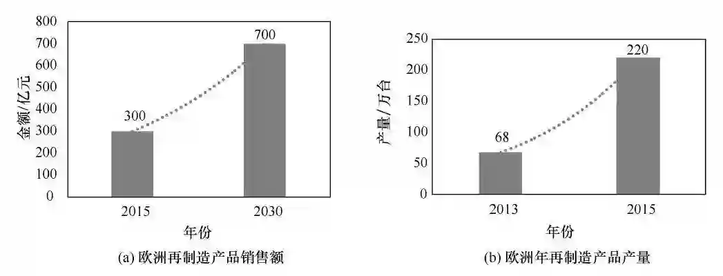 据相关数据显示,2015年欧洲的再制造市场金额已经达到300亿欧元,2030年产品销售额预计能够达到700亿欧元。2013年欧洲的年再制造的产量达到68万台,2015年则达到220万台,如图3所示。这个过程中再制造年产量飙升幅度大概为70%,这与欧洲2013~2015年一些政策的变化有关,例如,欧盟逐渐将再制造列入循环经济范围,促使很多再制造产业萌生,汽车再制造销售额占总再制造产品总额的20%。