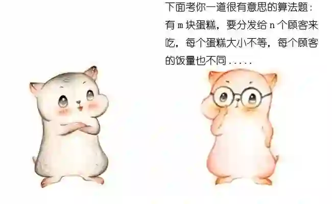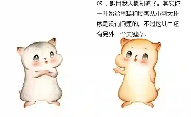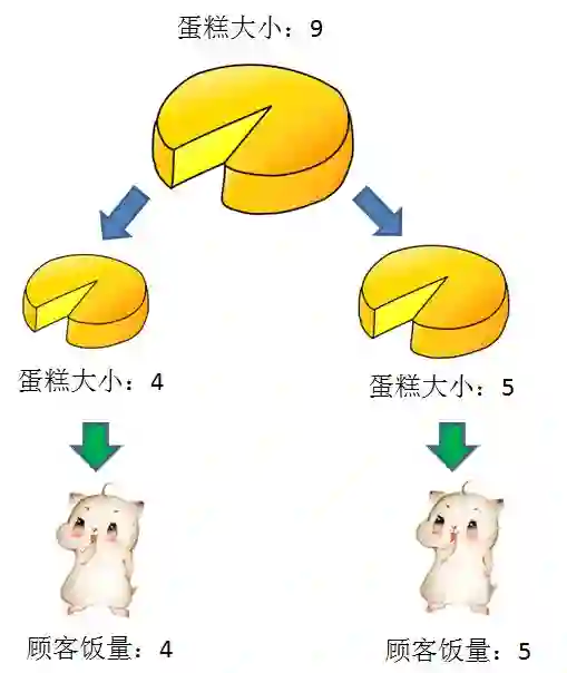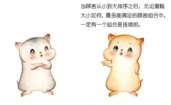 接下来,让每一个蛋糕和顾客按照从左到右的顺序匹配。如果蛋糕大于顾客饭量,则切分蛋糕;如果蛋糕小于顾客饭量,则丢弃该蛋糕。