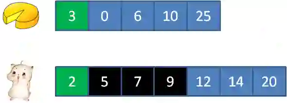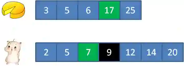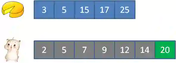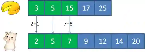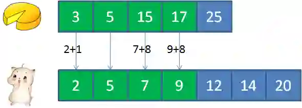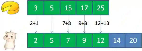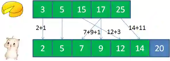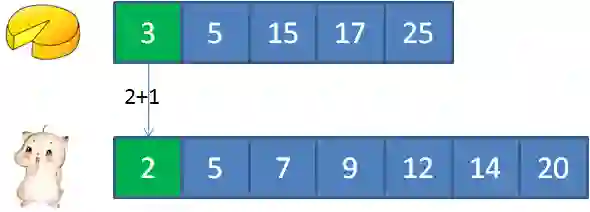 我们有5块蛋糕,蛋糕的大小分别是 5,17,25,3,15