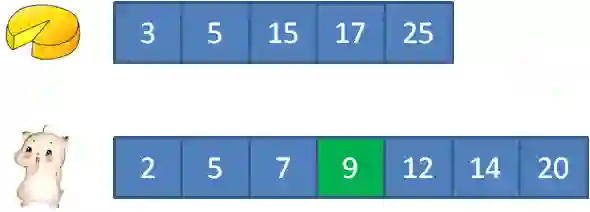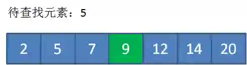 2.判断9>5,选择元素9左侧部分的中间元素,下标mid = (0+2)/2 = 1,因此中间元素是5: