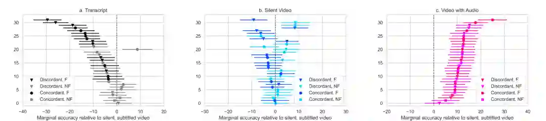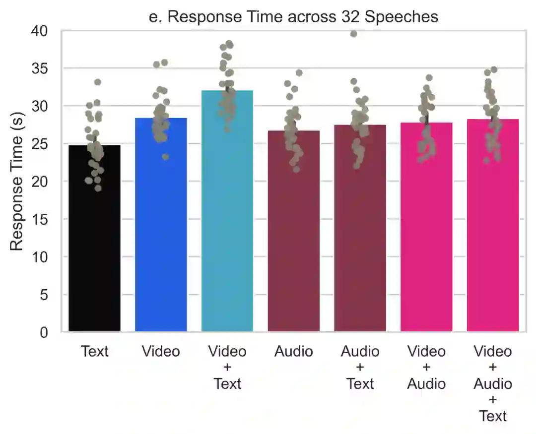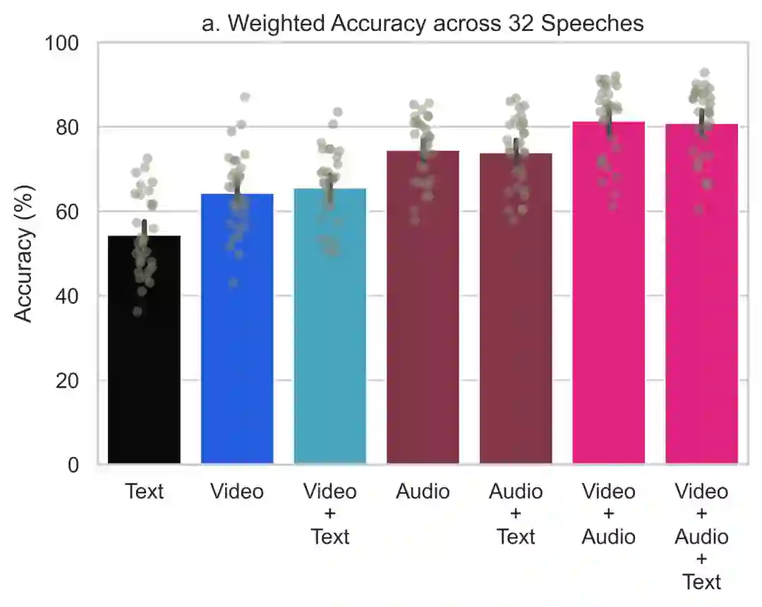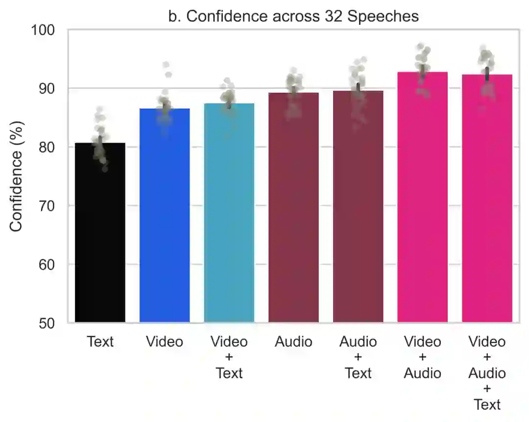 在文字记录中,受试者的平均确信度为81%。在视频和音频呈现的演讲上,受试者的确信度分别提高了6%和9%。如果把所有内容都提供给受试者,则可以让确信度提高12%。