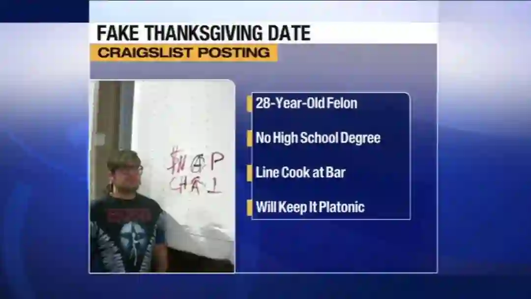 ▲ 上了当地电视新闻的Craigslist帖:28岁的坏人,高中没毕业,酒吧帮厨,柏拉图式恋爱,感恩节可以把我当成假男朋友带回家防止亲戚逼婚,不要钱,管饭就行。图/abc7news.com