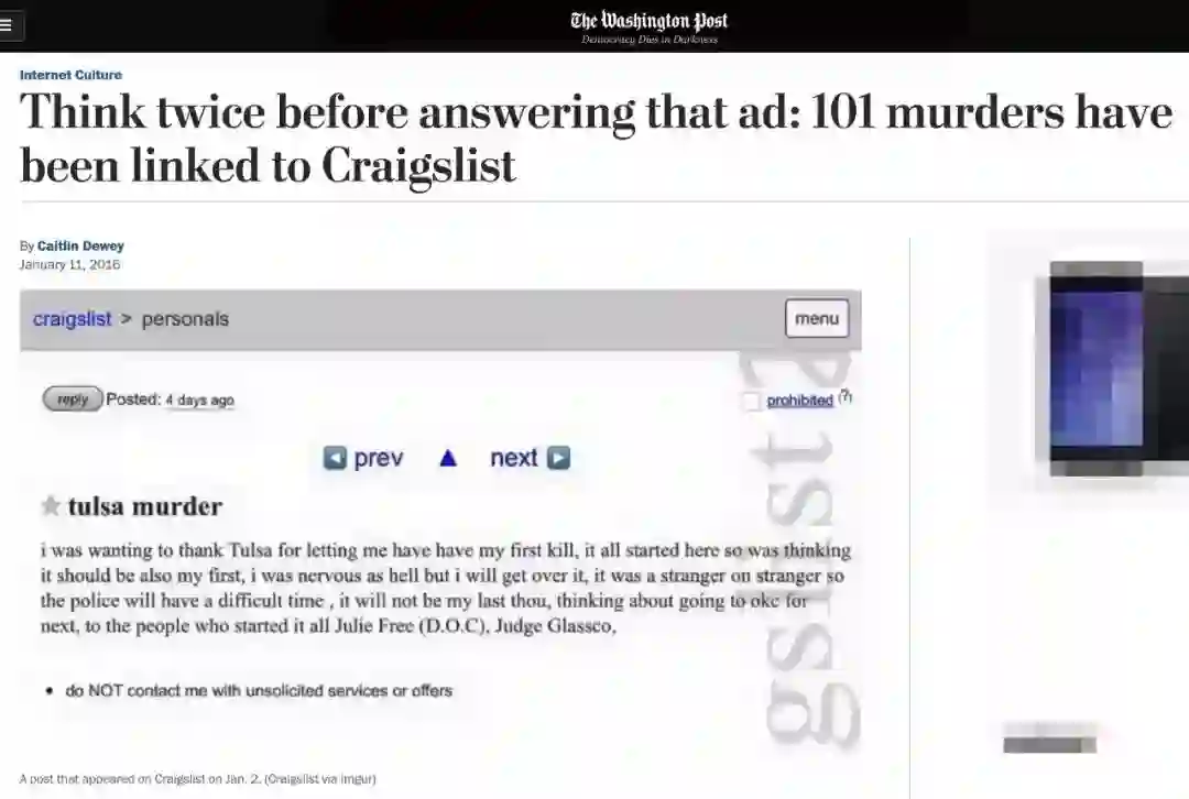 ▲ 2016年1月,有人在Craigslist发帖表示已完成第一次杀人。《华盛顿邮报》的新闻标题将“谋杀”与Craigslist紧密联系了起来。图/washingtonpost.com