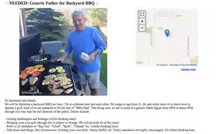 ▲ 招聘志愿者的版块曾有人发帖:寻真人老爸后院烧烤,需要边烤边喝啤酒的那种。图/huffingtonpost.com