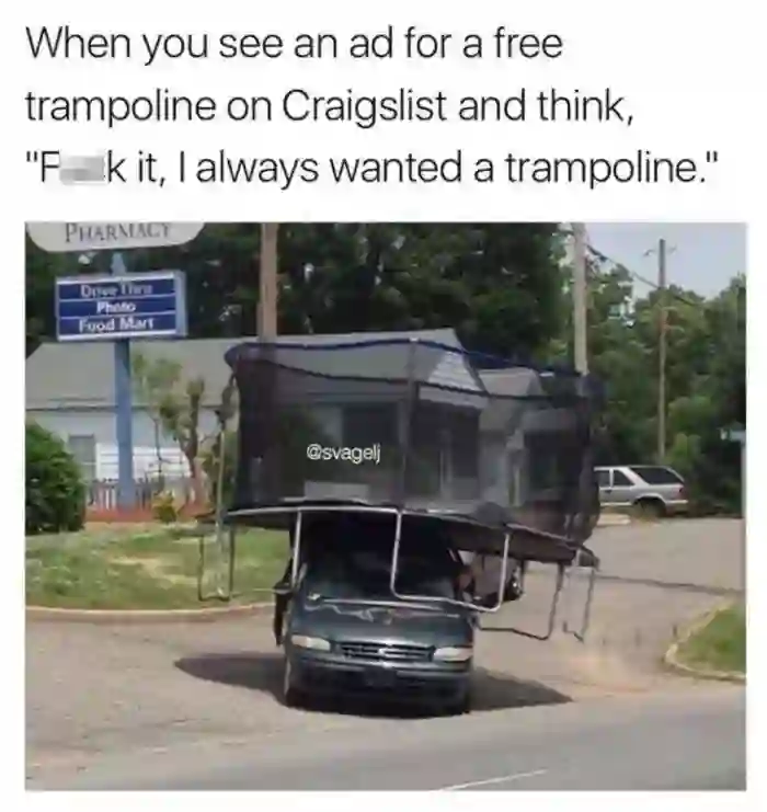 ▲ 在Craigslist上搞到了一个蹦床,倔强地拖回家。这下你知道为什么美国人喜欢开皮卡了吧?图/jokideo.com