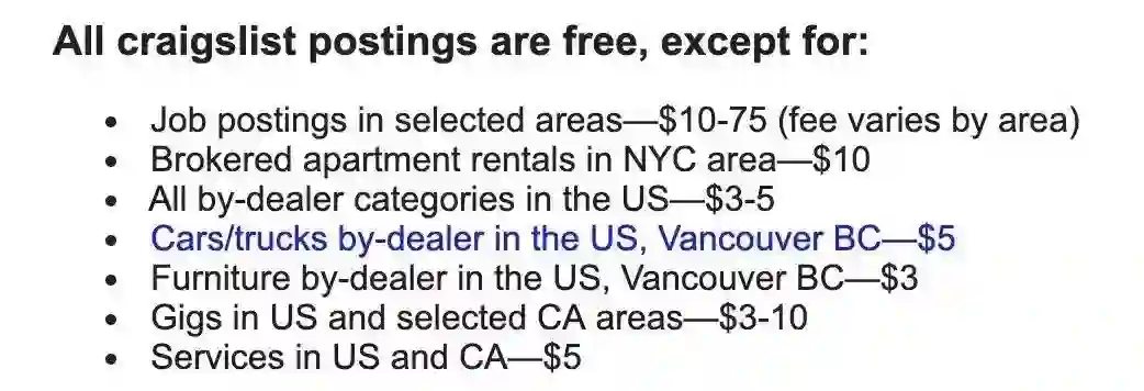▲ Craigslist的收费项目。Broker和dealer指职业经销商。