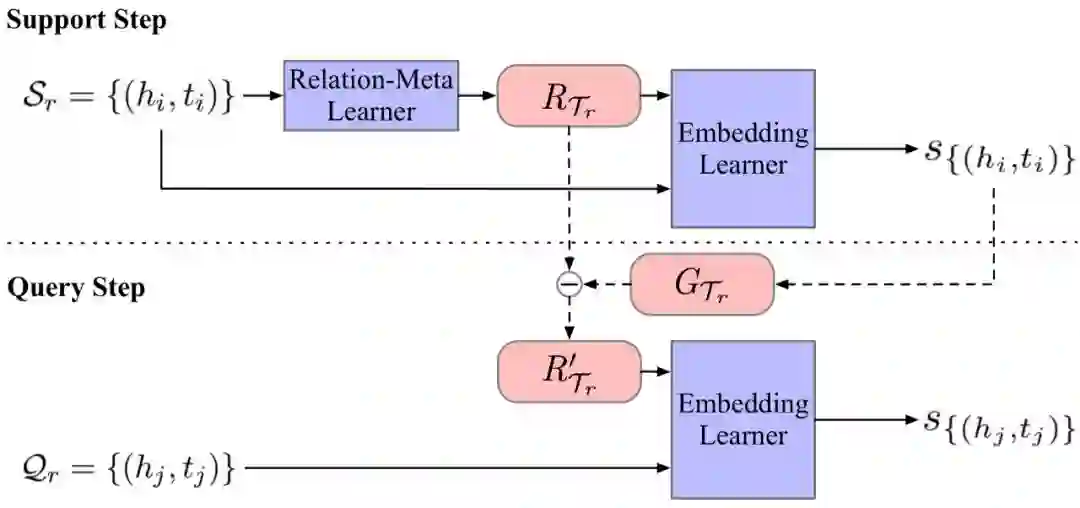 具体的模型分为两个部分,关系元学习器(Relation-Meta Learner)和嵌入学习器(Embedding Leaner)。关系元学习器是根据支持集的头实体和尾实体的向量表示得到两个实体间的关联,也就是关系元;嵌入学习器计算在支持集和查询集中,送入的头尾实体二元组和计算出的关系元的真值,类似于在做知识图谱嵌入时的得分函数,同时在支持集的阶段通过该真值而计算出的关系元的梯度作梯度元从而更新关系元。整个流程如下: