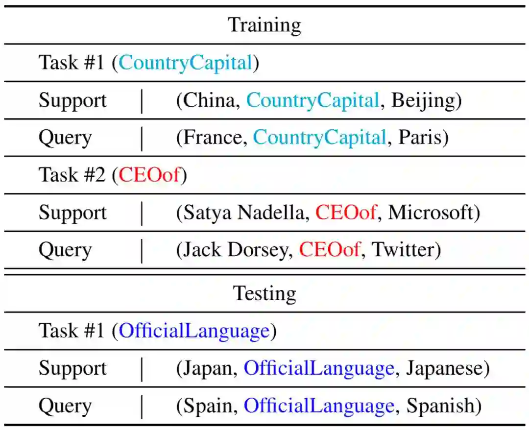 下表为知识图谱的单样本链接预测任务的训练和测试任务举例: