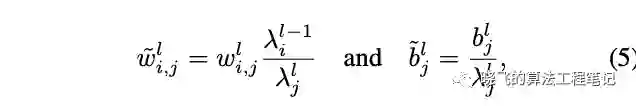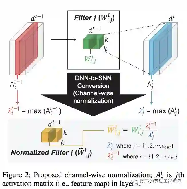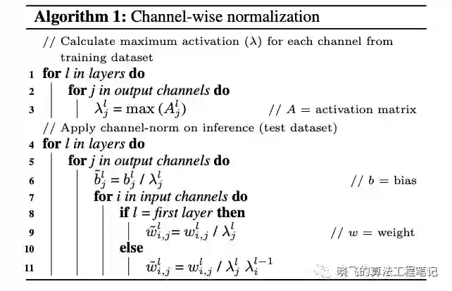 channel-wise归一化方法如公式5, 和 为维度下标, 层权值 通过在每个channel使用最大激活值 进行归一化,该值依然是从训练集计算的。对于非首层中,归一化的激活值必须乘上 来将输入还原为上一层归一化前的值,再进行本层的归一化,不然传递的信息会越来越小