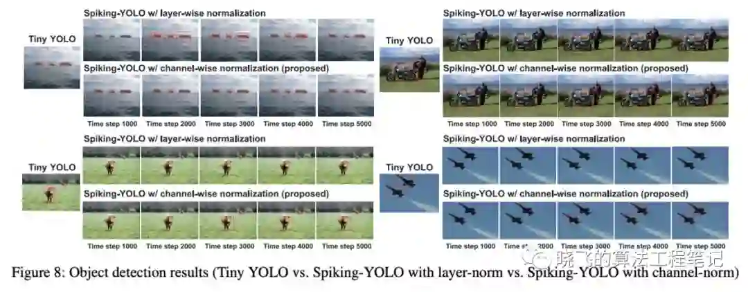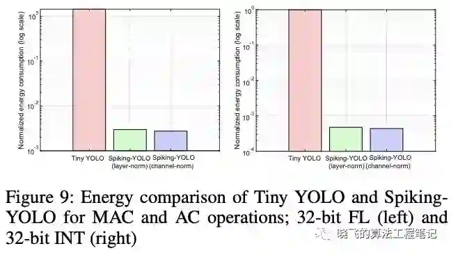 DNN主要使用相乘累积(multiply-accumulate , MAC)操作,而SNN则主要是累积操作(accumulate, AC),因为脉冲是二值的(1或-1),当接受到脉冲时,不用实时乘权重就可以知道结果。32-bit浮点型MAC和AC分别需要3.6pJ和0.9pJ,而32-bit整数型MAC和AC分别为3.2pJ和0.1pJ。如图9所示,不管使用哪种归一化方法,Spiking-YOLO的计算耗能仅为Tiny-YOLO的1/2000倍,能源利用十分高效