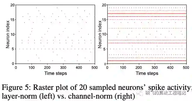 图5则随机采样了20个神经元,记录其脉冲活动,使用channel-norm使得大多数神经元能够更有规律地发射脉冲