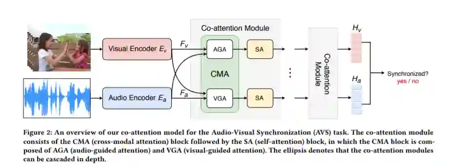 在观看视频时,视觉事件的发生往往伴随着声音事件,如唇动的声音,乐器演奏的音乐。视听事件之间存在着一种潜在的相关性,通过解决视听同步的代理任务,可以将其作为自监督信息来训练神经网络。在本文中,我们提出了一种新的带有共同注意力机制的自监督框架来学习无标记视频中的通用跨模态表示,并进一步使下游任务受益。具体而言,我们探讨了三个不同的共注意模块,以关注与声音相关的区分视觉区域,并介绍它们之间的相互作用。实验表明,与现有方法相比,我们的模型在参数较少的情况下,取得了较好的效果。为了进一步评估我们方法的可推广性和可迁移性,我们将预训练的模型应用于两个下游任务,即声源定位和动作识别。大量的实验表明,我们的模型可以提供与其他自监督方法竞争的结果,也表明我们的方法可以处理具有挑战性的场景包含多个声源。