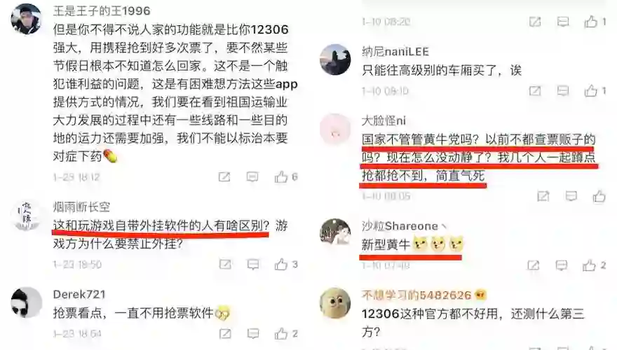 当部分人使用了“外挂”,没有外挂的人就成了利益受损者,他们在网络上抛出问题:抢票软件是黄牛吗,该取缔吗?