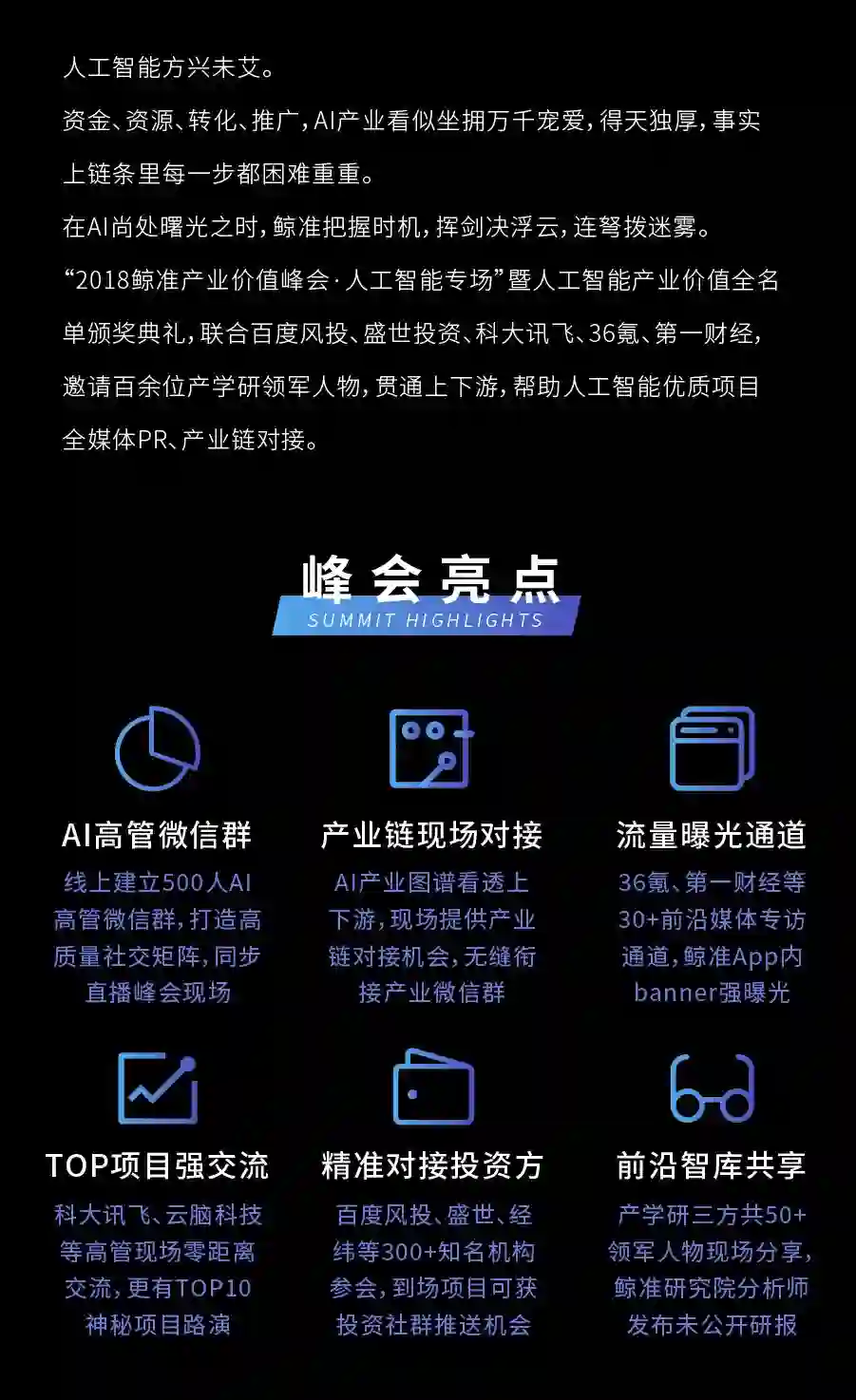为打通产业链、促成更多生态协同,鲸准将举办七大细分产业生态投资峰会,在首站 AI 之后,还会推出文娱、医疗健康等领域。