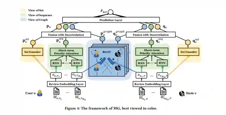 现有的基于评论的推荐模型主要从一组评论中学习长期用户和项目表示。由于忽略了评论丰富的侧面信息,这些模型存在两个缺点:1)不能捕捉评论中反映的用户偏好和条目特征的短期变化,2)不能准确地模拟来自评论的高阶用户-条目协作信号。为了克服这些限制,我们提出了一种名为集序列图(SSG)的多视图方法,通过引入两个额外的利用审查的视图:序列和图,来扩充现有的单视图(即集的视图)方法。特别地,对于分别以集合、序列和图的形式组织的评审,我们设计了一个三向编码器体系结构,它联合捕获用户和项目的长期(集合)、短期(序列)和协作(图)特性,以供推荐。对于序列编码器,我们提出了一个短期优先注意力网络,明确地考虑顺序和个性化的时间间隔审查。针对图码编码器,我们设计了一种新颖的回顾感知图注意网络来建模用户-项目图中的高阶多方面关系。为了消除捕获特性中潜在的冗余,我们的融合模块使用了跨视图去关系机制,以鼓励从多个视图进行不同的表示以进行集成。在公共数据集上的实验表明,SSG显著优于最先进的方法。