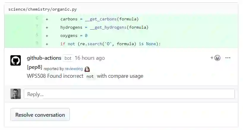 Wemake Python Styleguide的这一个步骤是我们最感兴趣的。它使用wemake-services/wemake-python-styleguide@0.13.4操作,这是工作流的基本组成单位。你可以在GitHub Marketplace上找到它们(https://github.com/marketplace?type=actions),就像上述提到的一样(https://github.com/marketplace/actions/wemake-python-styleguide)。将此代码配置为(with 语句)以使用github-pr-review reporter,就可以在code review中启用内联注释了。在官方网站上可以找到更多受支持的reporter选项。最后,此工作流需要传递你的GIHUB_TOKEN,这就是添加env语句的原因。
