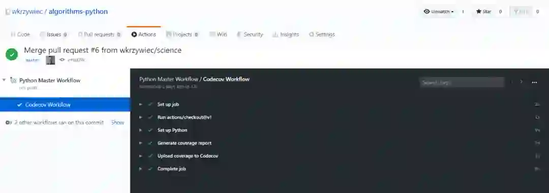 为了测试它的运行,你需要创建一个新的branch,提交一些更改并将其推送到GitHub。然后创建一个pull request,就能触发此工作流了。要检查它,请转到项目中的“Actions”选项,如果一切顺利则应如下图所示: