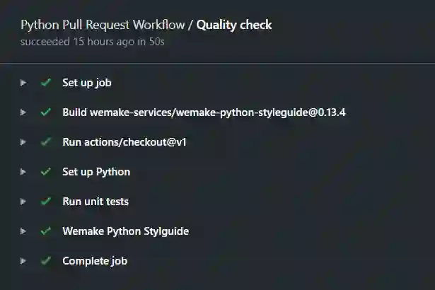 name: Python Pull Request Workflowon: [pull_request]jobs:qa:name: Quality check: ubuntu-18.04steps:uses: actions/checkout@v1name: Set up Pythonuses: actions/setup-python@masterwith:: 3.8name: Run unit testsrun: |pip install pytestpytestname: Wemake Python Stylguideuses: wemake-services/wemake-python-styleguide@0.13.4: truewith:reporter: 'github-pr-review'env:GITHUB_TOKEN: ${{ secrets.GITHUB_TOKEN }}