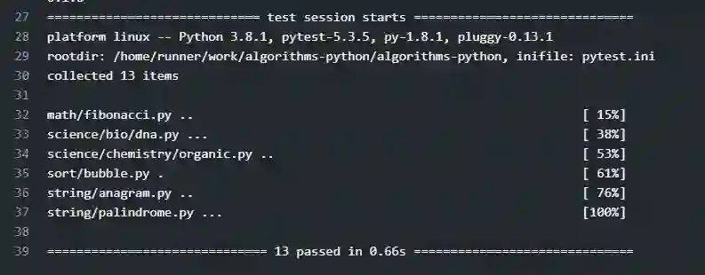 Run unit tests将运行位于项目中的所有单元测试。为此,我使用的是pytest,首先需要安装pip install pytest,以便可以运行下一个命令pytest。如果这一步上有任何一个测试失败,则下一个测试将不会运行。