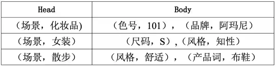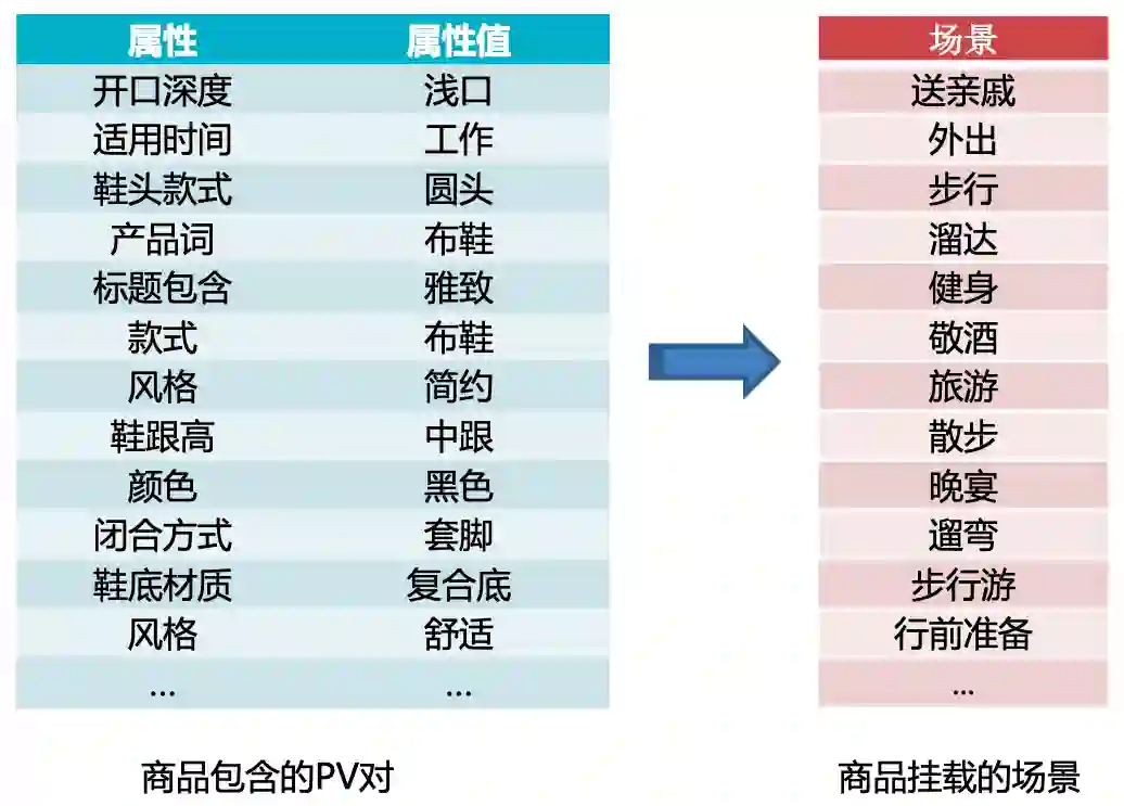 在电商实际应用中,每个商品都会被挂载到若干个场景,以图结构中的节点形式存在。商品由结构化信息表示,以键值对(Property:Value)形式(后称PV)存在。场景(LifeStyle)的价值则在于打通商品实体之间的联通,提供跨域的实体搭配,因此新的商品必须要通过规则库中的规则挂载到特定的场景才能进入电商的运营体系。商品场景的样例如下图所示。
