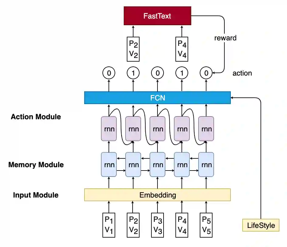 然后,要解决的第二个问题是如何为这个智能体返回reward,即如何判断智能体输出的PV对子序列可以让商品挂载到特定场景,且这个子序列的长度不超过5。判断挂载是否正确可以看作是一个分类问题,预训练一个FastText网络作为分类器,输入为PV对序列,输出为PV对序列所对应的类(即场景),来判断当前PV子序列能否分类到对应场景。同时,在reward function中加入子序列长度项,让智能体尽可能选择较短的子序列。
